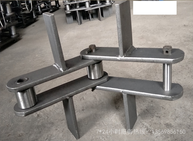 焊接弯板链链条每节有两个链板,两个销轴,两个套筒(焊接到链板上)及4个卡环组成。一系列的弯板链节用销轴连接组成,板孔与销轴的连接可以采用过盈配合或采用机械止锁方式,其销轴、链扳均经过特殊热处理可进行全面硬化和部分硬化,提供了非常大的耐碰撞性和非常佳的抗磨寿命,链条两翼与耐磨刮板通过螺栓连接。链条在与头轮轮齿啮合和在导轨上运行时是滑动摩擦。焊接弯板链的特点是针对强烈冲击性、磨损性物料的输送。能够经受持久磨损,高强度冲击。存在的问题:对于生产厂家制造要求高。如果表面处理处理不到位,热处理工艺不够,焊接后不进行回火去应力,焊丝选型不对等,均易造成焊缝、链板及销轴断裂等情况。