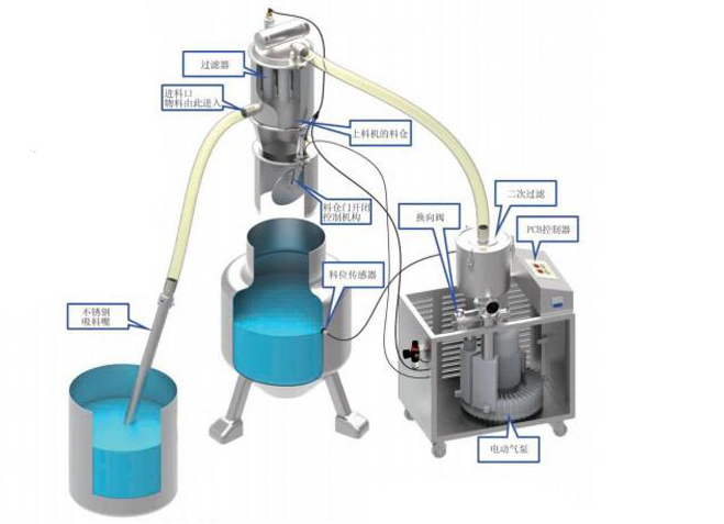 真空真空上料机是用旋涡气泵抽气,使吸料嘴进口处及整个系统处于一定的负压状态,粉粒料随同外界空气被吸入料嘴,形成料气流,经过吸料管到达料斗,在料斗中进行气、料分离。分离后的物料进入受料设备。送料——放料是通过气动换向阀不断地开、闭来完成的,而气动换向阀的开闭是由控制中心来控制的。